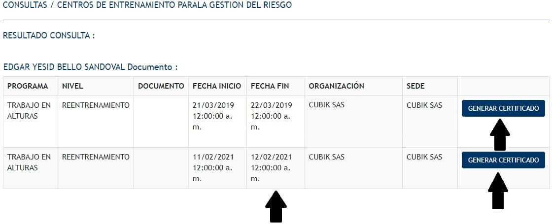 2.- En la página aparecerá el nombre del titular del documento, la fecha de inicio de la formación, fecha de finalización y el centro de entrenamiento. El tiempo de vigencia de su certificado aplica desde la fecha de finalización, si ha transcurrido más de 1 año debe renovar su certificado mediante el curso de alturas.